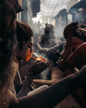 Shot by Dev Dodia. A close moment of Babas sharing silence and smoke, shrouded in mysticism at the Kumbh Mela.