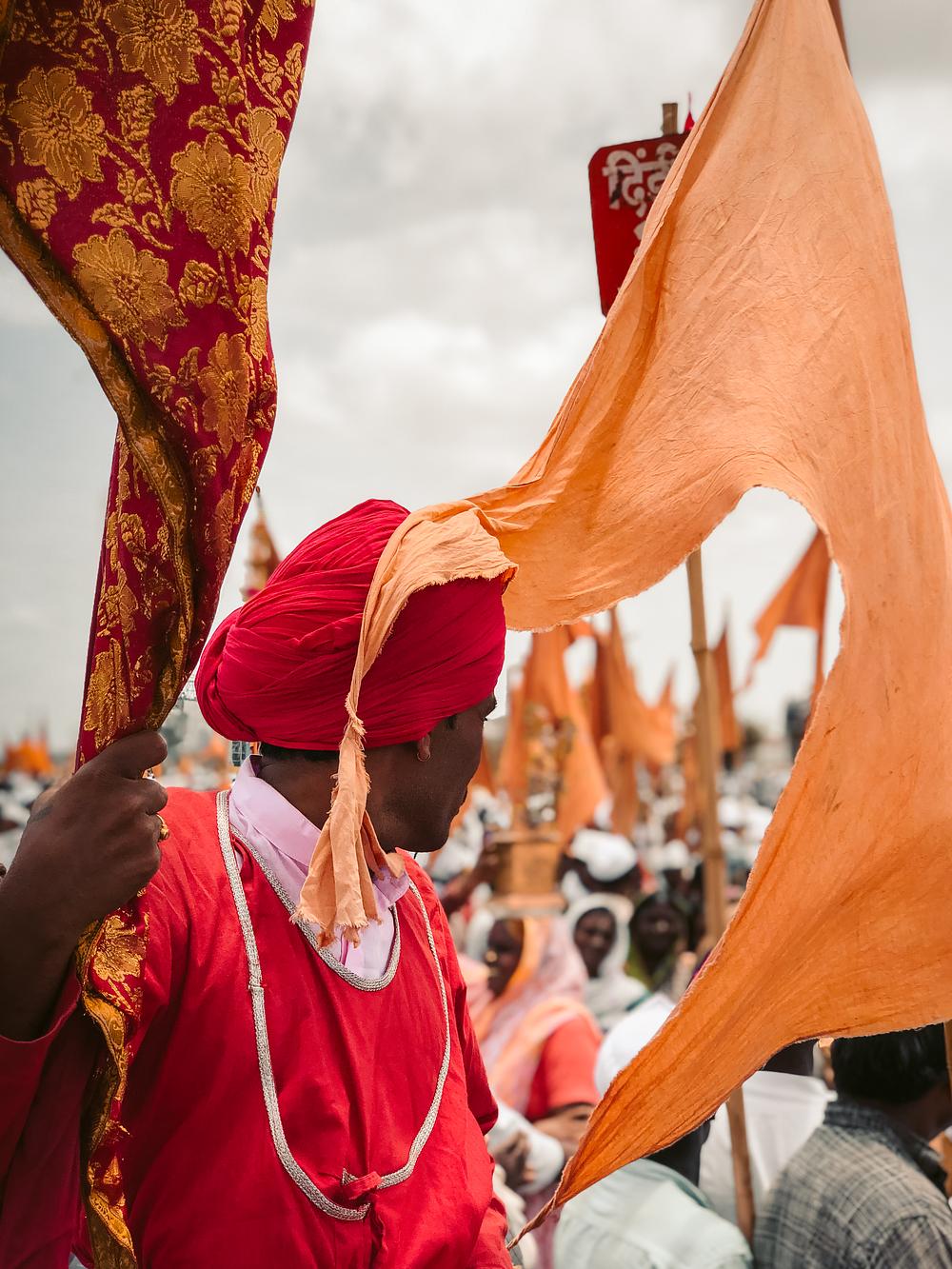 Photo by Dev Dodia. A devotee holds a flag high during the Wari festival in Pandharpur, embodying faith and tradition. Shot in Maharashtra 2019.